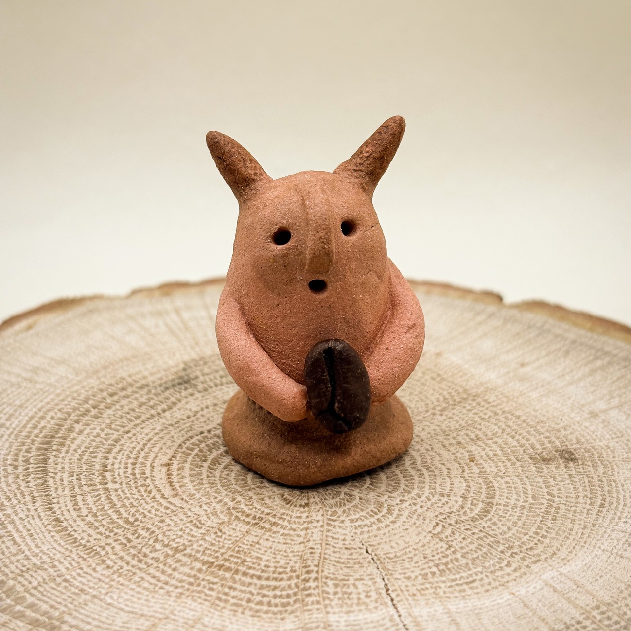 本物の焙煎豆を持った可愛い手乗りはにわです。
