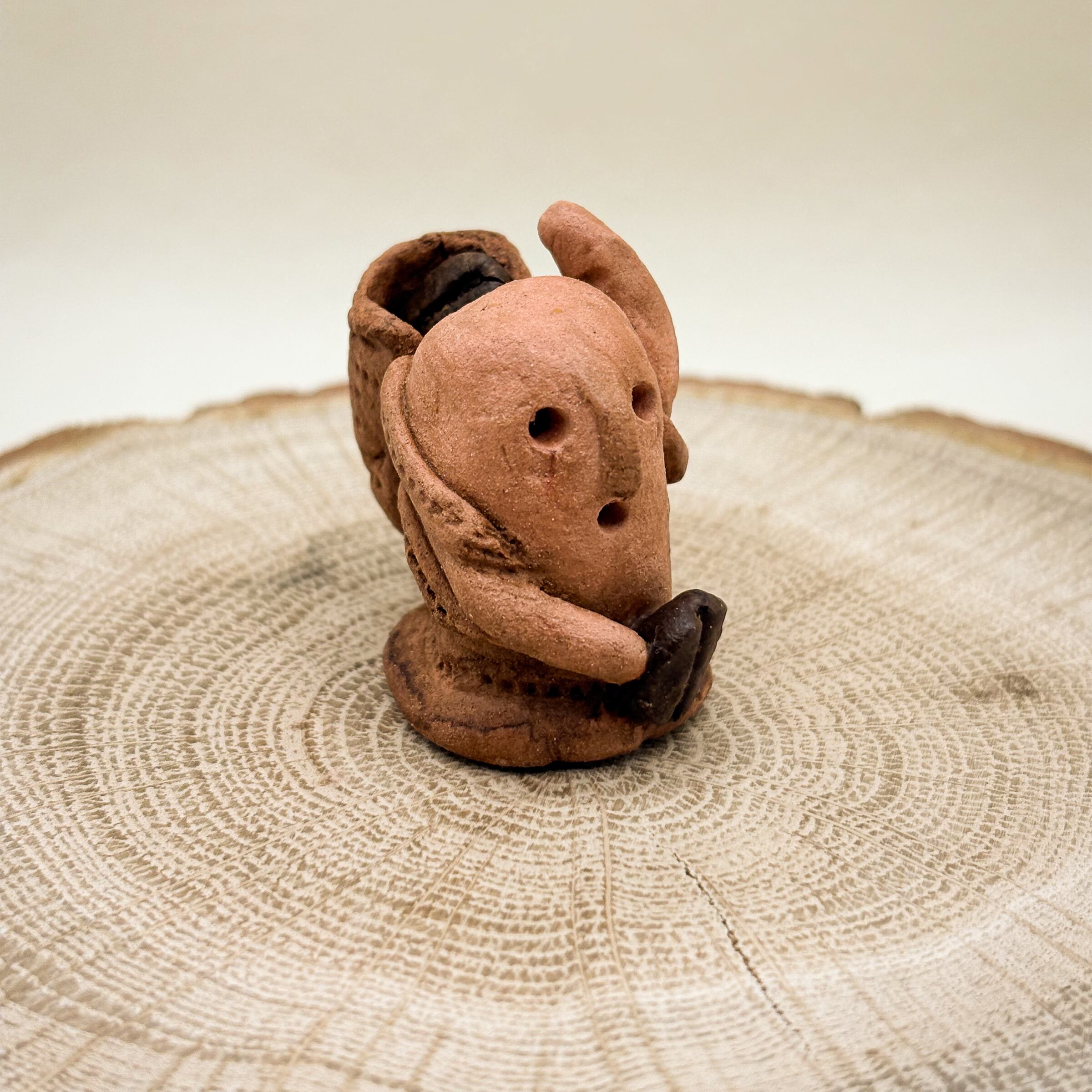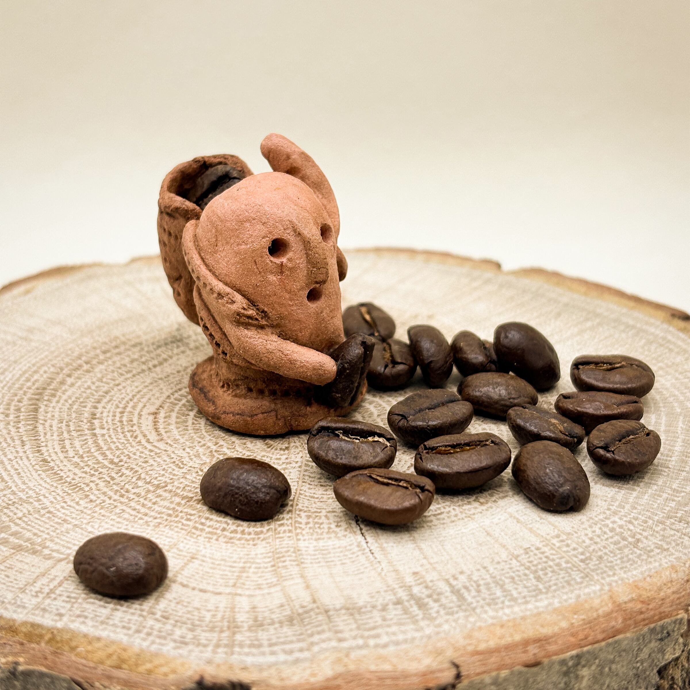 本物の焙煎豆を持った可愛い手乗りはにわです。