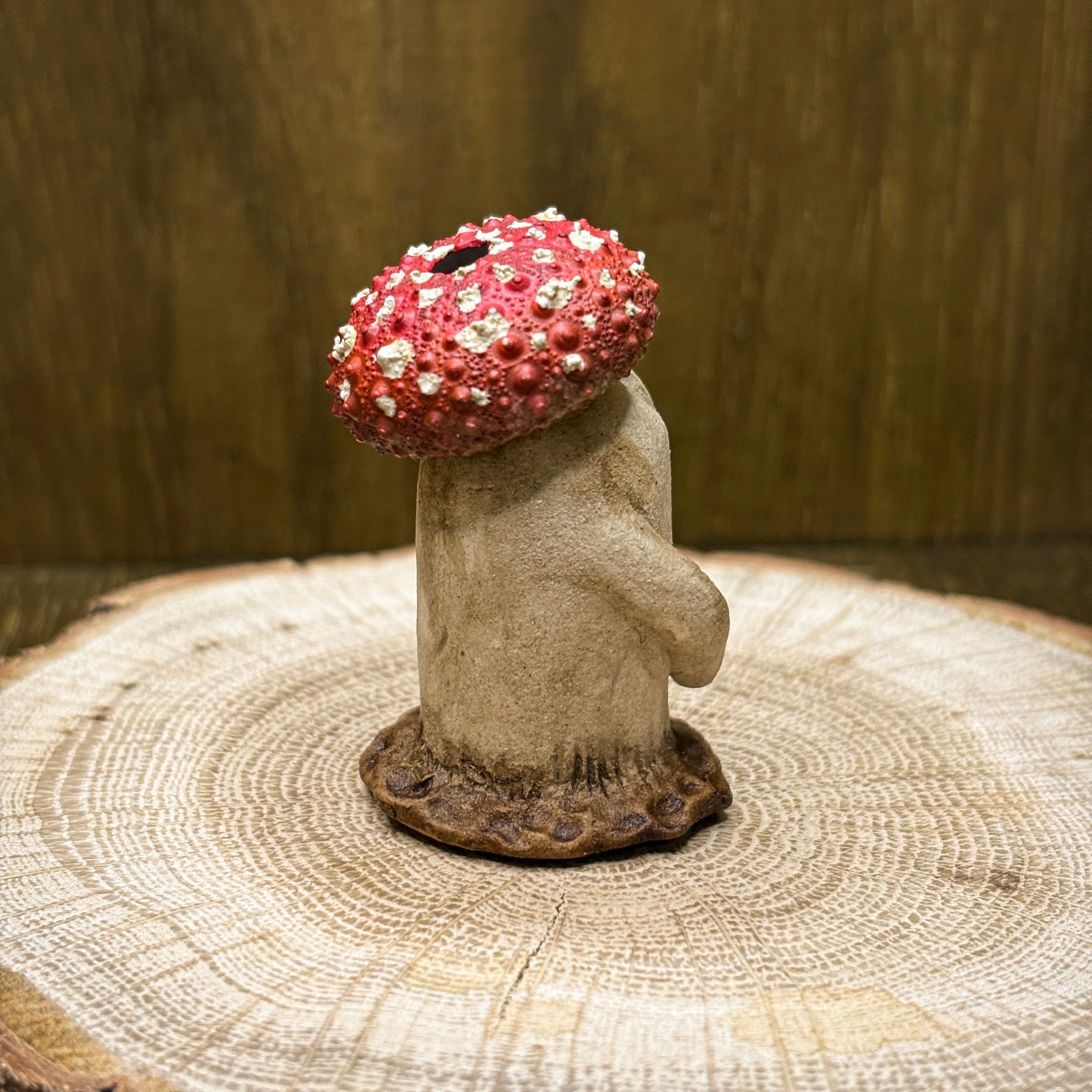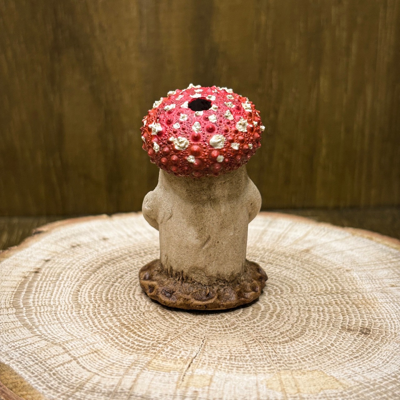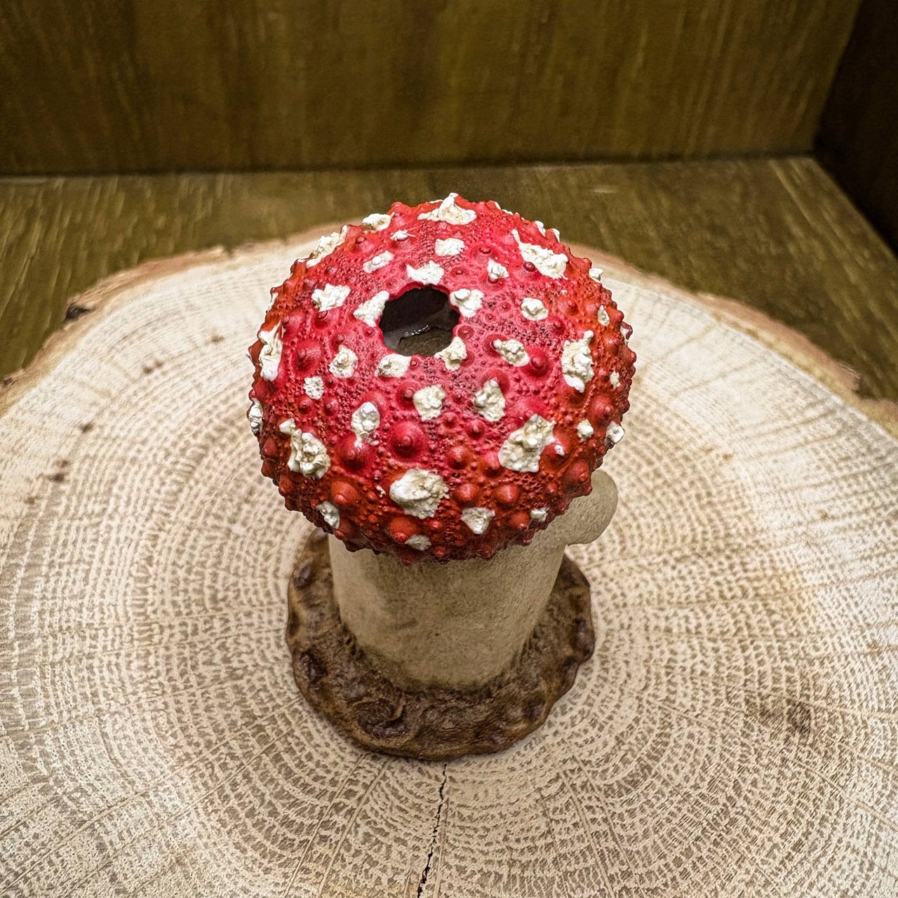 キノコの傘には本物のウニの殻に絵の具で着彩しています。